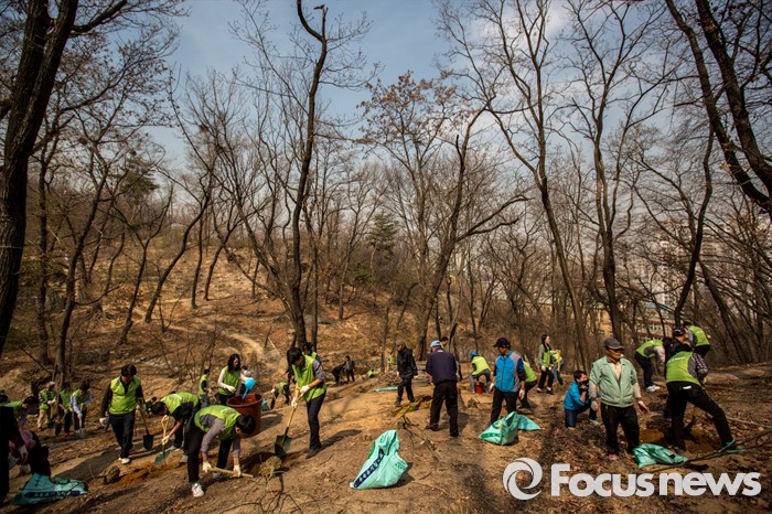 (서울=포커스뉴스) 1일 오후 서울 동대문구 배봉산에서 동대문구청 직원들이 식목일을 앞두고 나무를 심고 있다.