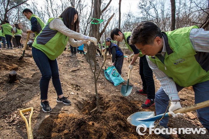 (서울=포커스뉴스) 1일 오후 서울 동대문구 배봉산에서 동대문구청 직원들이 식목일을 앞두고 나무를 심고 있다.