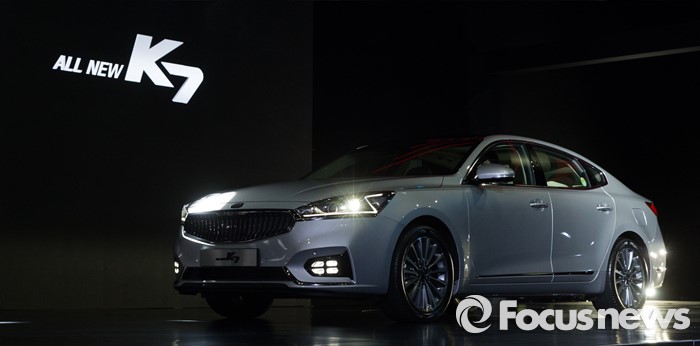 차종별로는 올해 초부터 판매가 본격화 된 신형 스포티지의 판매 호조와프라이드, K3, K5 등 해외 시장 주력 차종들이 판매를 견인했다. 1·4분기 해외 판매는 57만 6,964대로 지난해 63만 6,650대보다 9.4% 감소했다.(서울=포커스뉴스) 26일 오전 서울 강남구 그랜드 인터컨티넨탈 서울 파르타스에서 열린 '기아차 올 뉴 K7 신차발표회'에서 K7 차량이 무대 위에 전시되어 있다. 2016.01.26 오장환 기자
