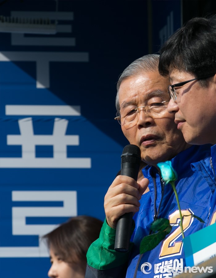 (완주=포커스뉴스) 1일 오후 전북 완주군 둔산공원 앞 사거리에서 김종인(왼쪽) 더불어민주당 비대위 대표 겸 선대위원장이 안호영 완주·진안·무주·장수군 후보의 지지를 호소하고 있다.