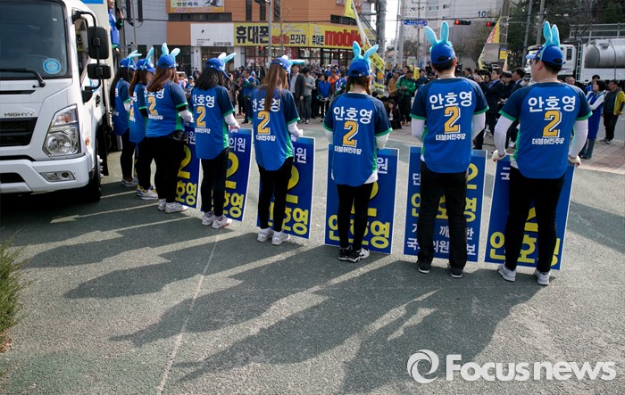 (완주=포커스뉴스) 1일 오후 전북 완주군 둔산공원 앞 사거리에서 안호영 더불어민주당 완주·진안·무주·장수군 후보의 선거운동원들이 지지를 호소하고 있다.