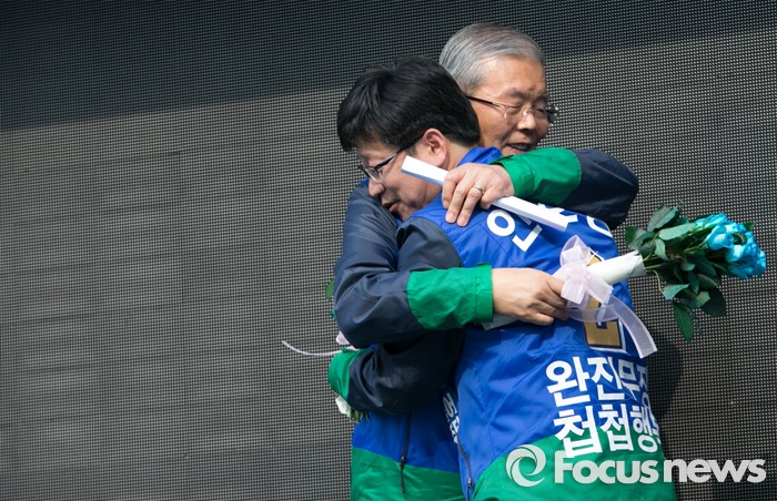 (완주=포커스뉴스) 1일 오후 전북 완주군 둔산공원 앞 사거리에서 김종인(왼쪽) 더불어민주당 비대위 대표 겸 선대위원장가 안호영 완주·진안·무주·장수군 후보와 포옹을 하며 격려하고 있다.