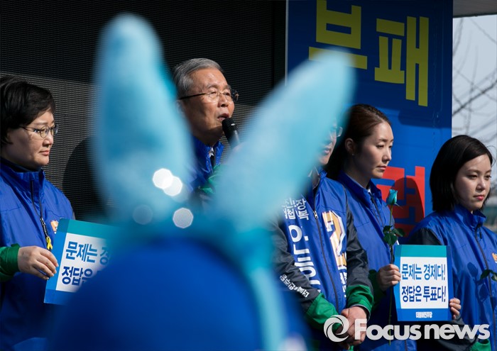 (완주=포커스뉴스) 1일 오후 전북 완주군 둔산공원 앞 사거리에서 김종인 더불어민주당 비대위 대표 겸 선대위원장이 안호영 완주·진안·무주·장수군 후보의 지지를 호소하고 있다.