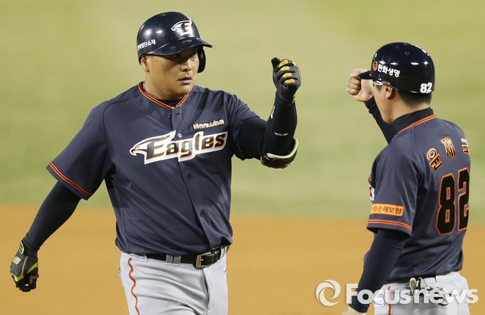 (서울=포커스뉴스) 1일 서울 잠실구장에서 열린 2016프로야구 개막전 한화-LG 경기에서 1회초 1사 2,3루에서 한화 김태균이 2타점 적시타를 치고 1루에서 윤재국 코치와 주먹을 마주치고 있다.