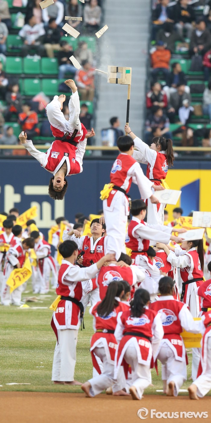 (서울=포커스뉴스) 1일 서울 잠실구장에서 열린 2016프로야구 개막전 한화-LG 경기에 앞서 열린 개막식 식전 행사에서 태권도 어린이 시범단 선수가 고난도의 격파를 선보이고 있다.