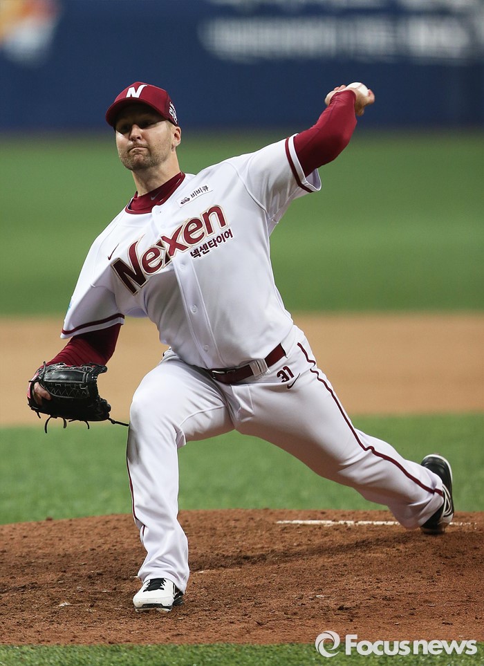 (서울=포커스뉴스) 1일 오후 서울 구로구 고척스카이돔에서 열린 2016 타이어뱅크 프로야구 개막전 넥센 히어로즈와 롯데 자이언츠의 경기 2회 넥센 피어밴드가 투구하고 있다.