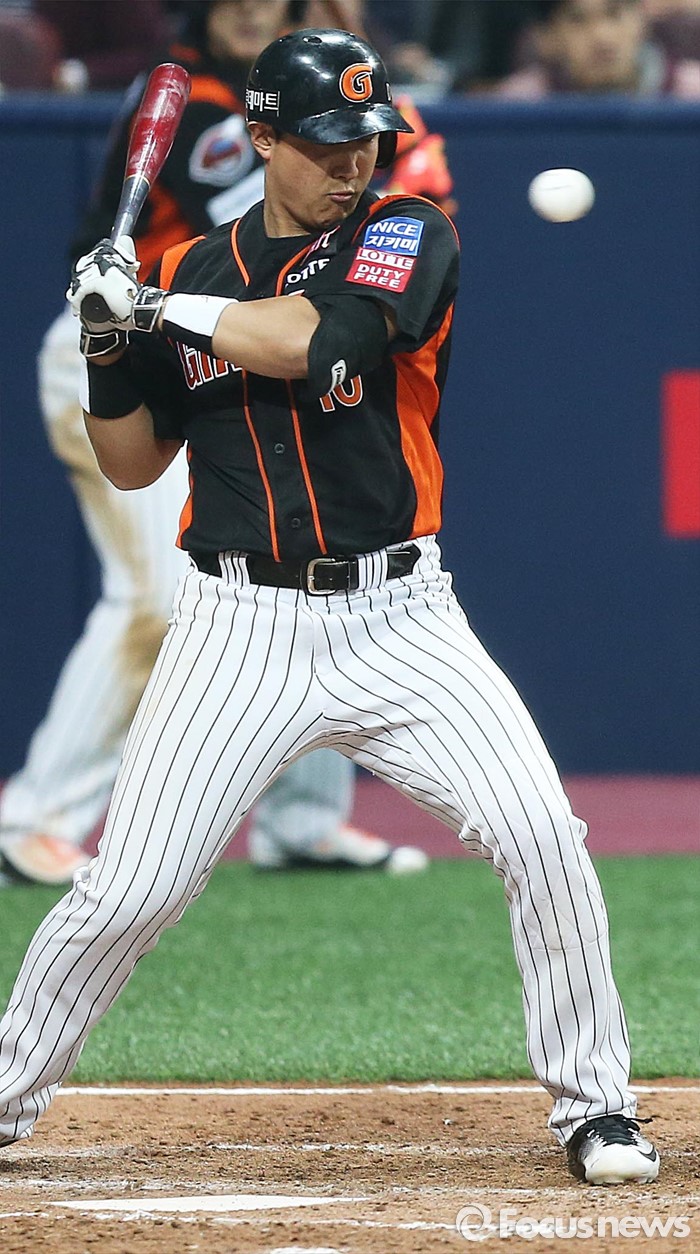(서울=포커스뉴스) 1일 오후 서울 구로구 고척스카이돔에서 열린 2016 타이어뱅크 프로야구 개막전 넥센 히어로즈와 롯데 자이언츠의 경기 7회초 1사 1,2루 상황 롯데 황재균이 공을 피하고 있다.