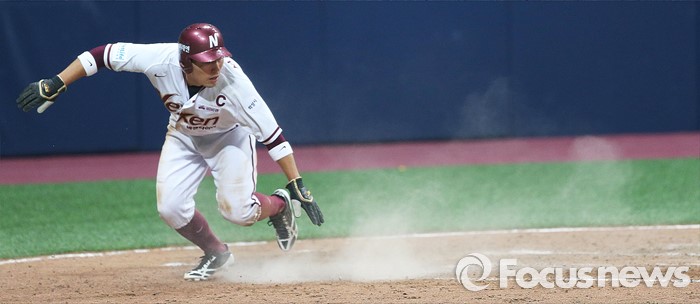 (서울=포커스뉴스) 1일 오후 서울 구로구 고척스카이돔에서 열린 2016 타이어뱅크 프로야구 개막전 넥센 히어로즈와 롯데 자이언츠의 경기 7회말 1사 3루 상황 넥센 이택근이 친 희생 플라이에 서건창이 홈을 밟고 있다.