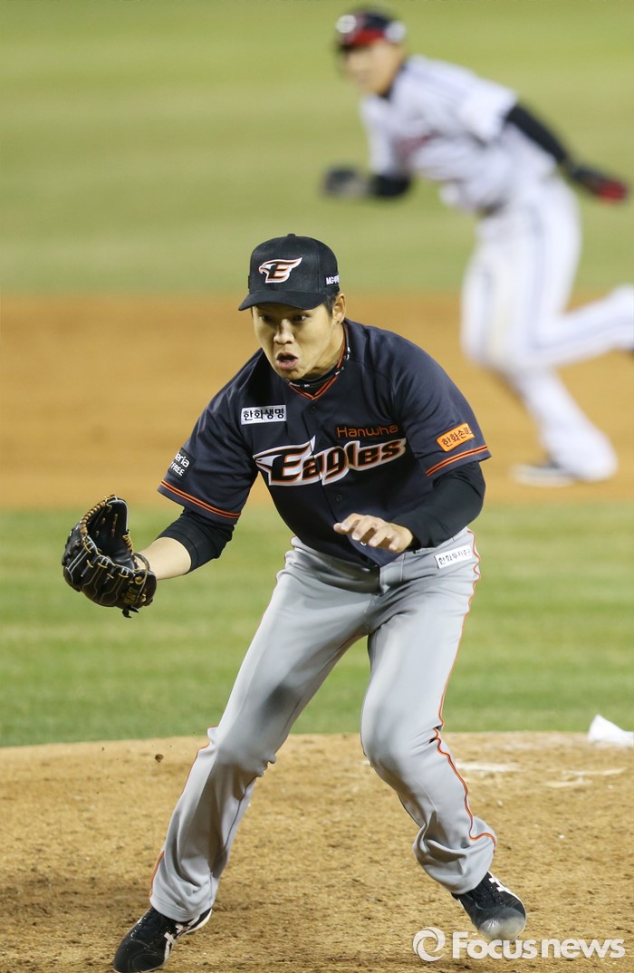 (서울=포커스뉴스) 1일 서울 잠실구장에서 열린 2016프로야구 개막전 한화-LG 경기4회말 1사 1,2루에서 한화 투수 박정진이LG 임훈의 투수앞 땅볼을 잡고 있다.