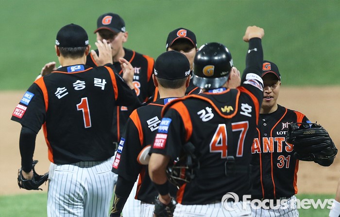 (서울=포커스뉴스) 1일 오후 서울 구로구 고척스카이돔에서 열린 2016 타이어뱅크 프로야구 개막전 넥센 히어로즈와 롯데 자이언츠의 경기에서 롯데가 2:1로 승리한 후 환호하고 있다.
