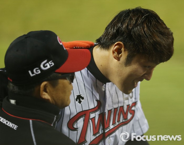 (서울=포커스뉴스) 1일 서울 잠실구장에서 열린 2016프로야구 개막전 한화-LG 경기 연장 12회말 1사 2루에서 LG 양석환이 좌익수를 넘기는 역전 2루타를 날리고 양상문 감독의 축하를 받고 있다.
