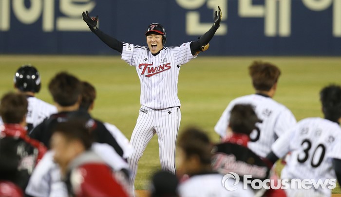 (서울=포커스뉴스) 1일 서울 잠실구장에서 열린 2016프로야구 개막전 한화-LG 경기 연장 12회말 1사 2루에서 좌익수를 넘기는 역전 2루타를 날리고 환호하는LG 양석환에게 동료들이 달려 나가고 있다.