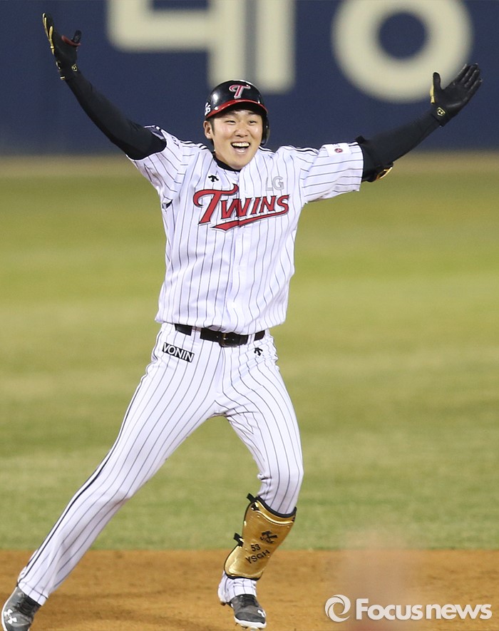 (서울=포커스뉴스) 1일 서울 잠실구장에서 열린 2016프로야구 개막전 한화-LG 경기 연장 12회말 1사 2루에서 좌익수를 넘기는 역전 2루타를 날린 LG 양석환이 환호하고 있다.