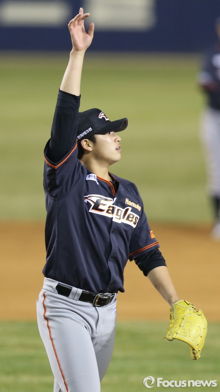 (서울=포커스뉴스) 1일 서울 잠실구장에서 열린 2016프로야구 개막전 한화-LG 경기 연장 11회말에 한화 투수 김민우가 LG 정성훈의 1루수 쪽에 뜬타구를 가리키고 있다.