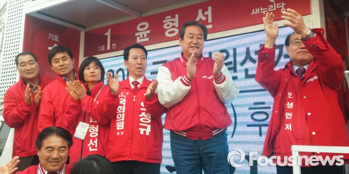 (인천=포커스뉴스) 김무성(오른쪽 두번째) 새누리당 대표가 2일 오전 인천 계양구 병방시장 입구에서 열린 윤형선(오른쪽) 계양을 후보 지원 유세에 참석해 박수치고 있다.