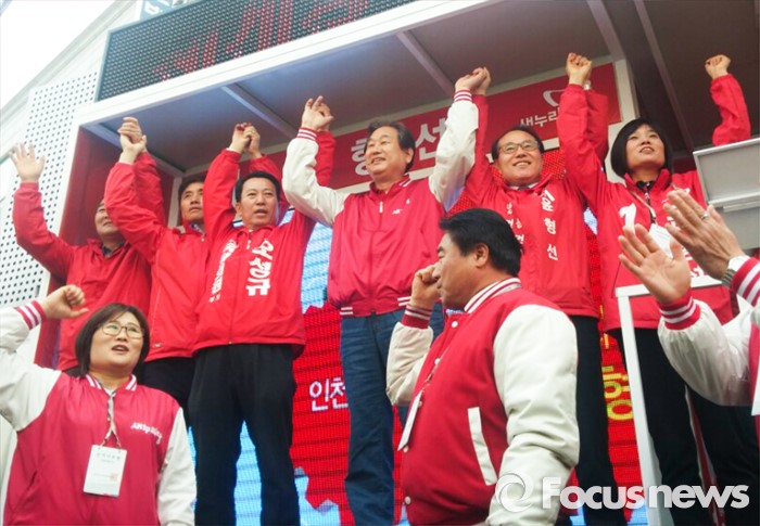 (인천=포커스뉴스) 김무성(가운데) 새누리당 대표가 2일 오전 인천 계양구 병방시장 입구에서 열린 윤형선(오른쪽 두번째) 계양을 후보 지원 유세에 참석해 손을 들고 있다.