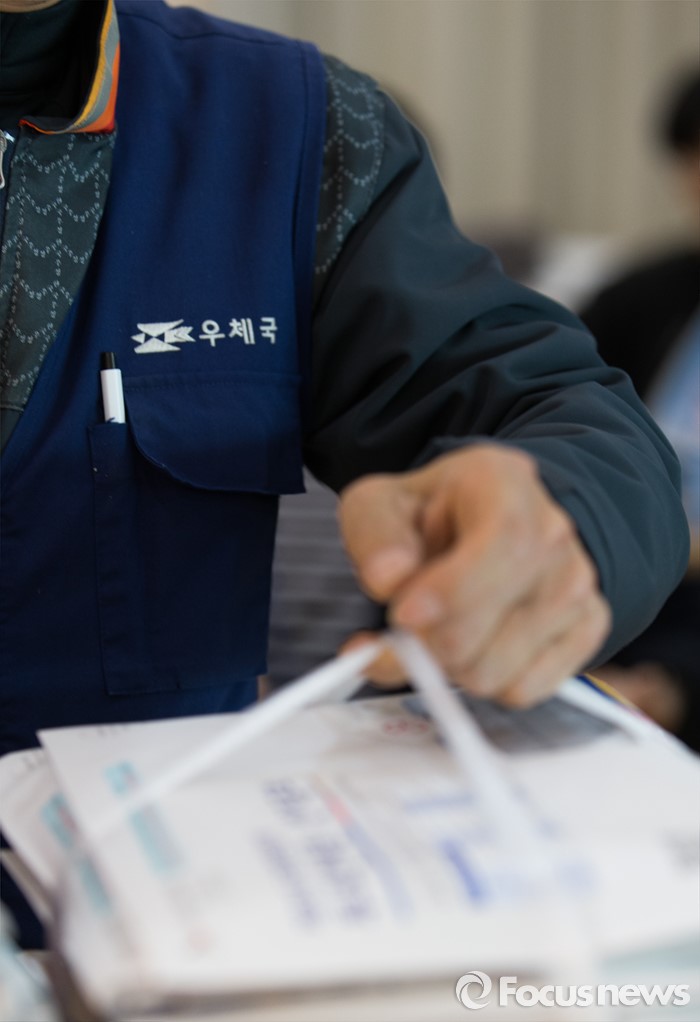 (서울=포커스뉴스)제20대 국회의원 선거 공보물 정리 작업이 진행된 2일 오후 서울 안암동 주민센터에서 집배원이 가정으로 전달될 공보물들을 옮기고 있다.