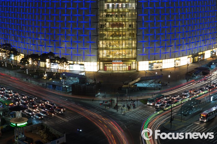 | △ 파란 LED 조명 켜진 롯데월드타워 외벽 |