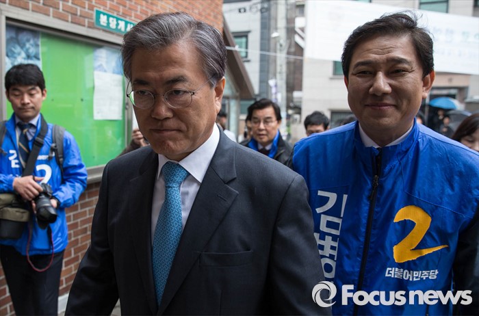 (서울=포커스뉴스) 선거운동이 시작되고 첫 주말을 맞은 3일 오전 문재인 전 더불어민주당 대표가 서울 동작구 신대방성당에서 김병기 더불어민주당 동작갑 후보를 찾아 합동유세를 하고 있다.