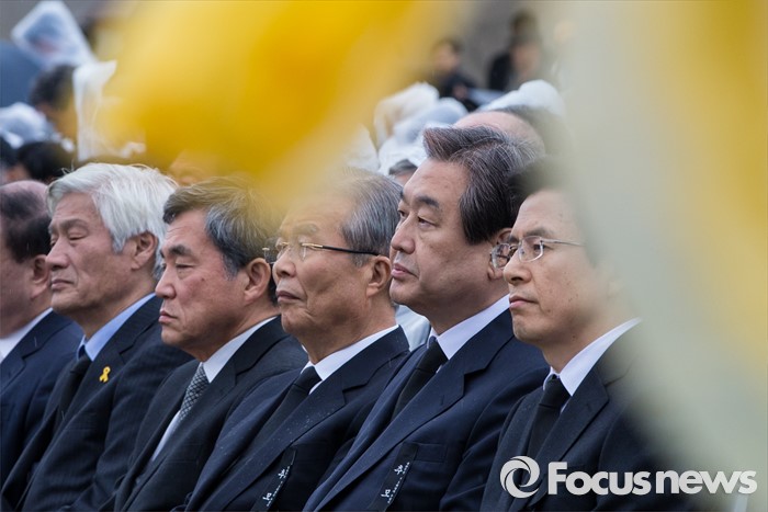 (제주=포커스뉴스) 3일 오전 제주 4ㆍ3 평화공원에서 열린 제68주년 4ㆍ3희생자 추념식에 참석한 김세균(왼쪽부터) 정의당 공동대표, 이상돈 국민의당 공동선대위원장, 김종인 더불어민주당 비상대책위원회 대표, 김무성 새누리당 대표, 황교안 국무총리가 추도사를 듣고 있다.