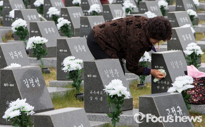 (제주=포커스뉴스) 3일 오전 제주 4ㆍ3 평화공원에서 열린 제68주년 4ㆍ3희생자 추념식에 참석한 시민이 위령비의 빗물을 닦고 있다.