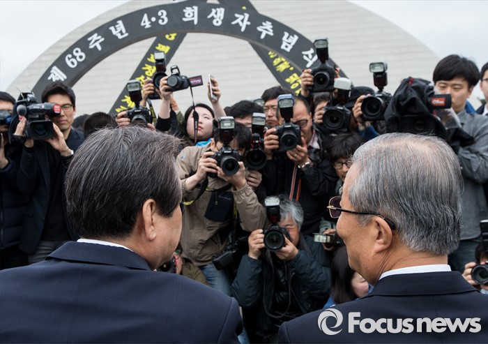 (제주=포커스뉴스) 3일 오전 제주 4ㆍ3 평화공원에서 열린 제68주년 4ㆍ3희생자 추념식에 참석한 김무성(왼쪽) 새누리당 대표와 김종인 더불어민주당 비상대책위원회 대표가 대화하고 있다.