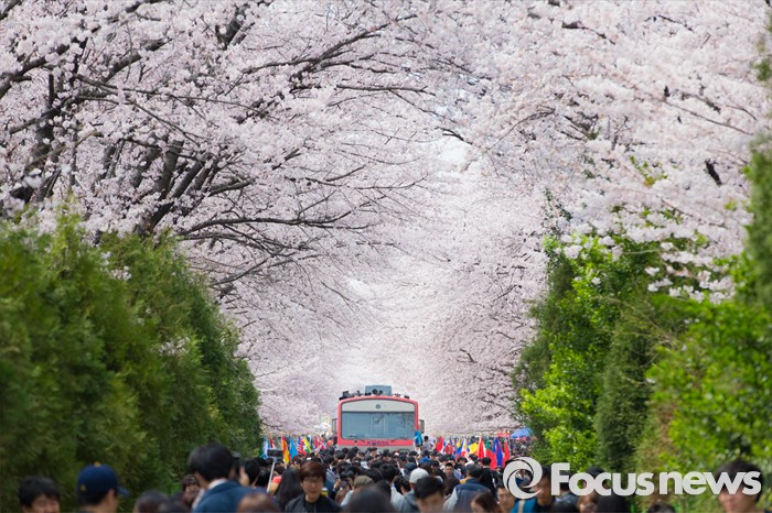 (창원=포커스뉴스) 2일 오후 경남 창원시 진해구 경화역을 찾은 관광객들이 만개한 벚꽃을 보며 즐거운 시간을 보내고 있다.