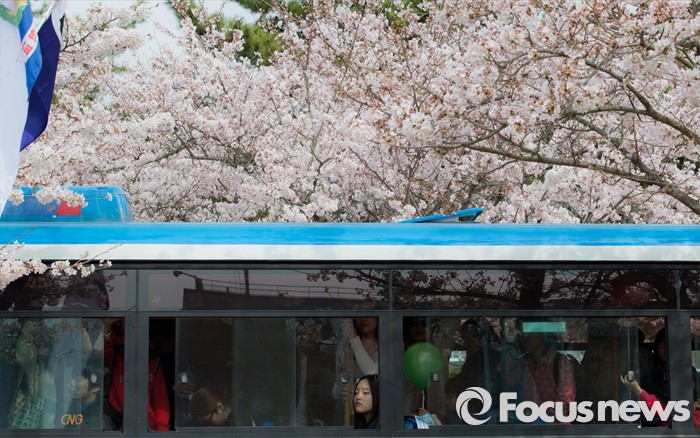 (창원=포커스뉴스) 2일 오후 경남 창원시 진해구 해군사관학교를 찾은 관광객들이 만개한 벚꽃을 보며 이동하고 있다.