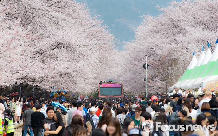 (창원=포커스뉴스) 2일 오후 경남 창원시 진해구 경화역을 찾은 관광객들이 만개한 벚꽃을 보며 즐거운 시간을 보내고 있다.