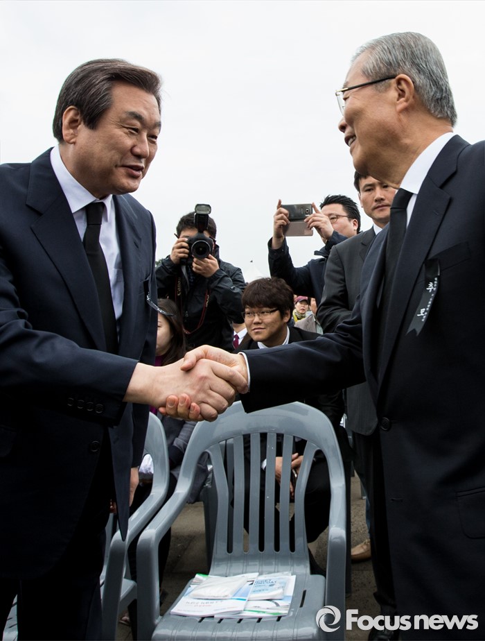 (제주=포커스뉴스) 3일 오전 제주 4ㆍ3 평화공원에서 열린 제68주년 4ㆍ3희생자 추념식에 참석한 김무성(왼쪽) 새누리당 대표와 김종인 더불어민주당 비상대책위원회 대표가 악수하고 있다.