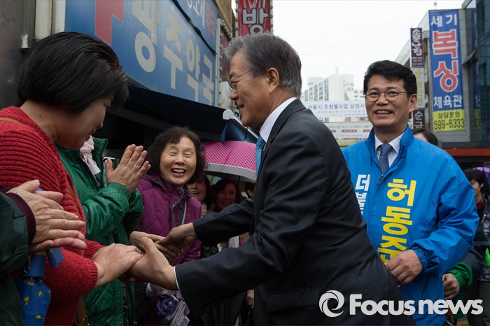 (서울=포커스뉴스) 선거운동이 시작되고 첫 주말을 맞은 3일 오후 문재인 전 더불어민주당 대표가 서울 동작구 남성시장에서 허동준 더불어민주당 동작을 후보와 합동유세를 하고 있다.