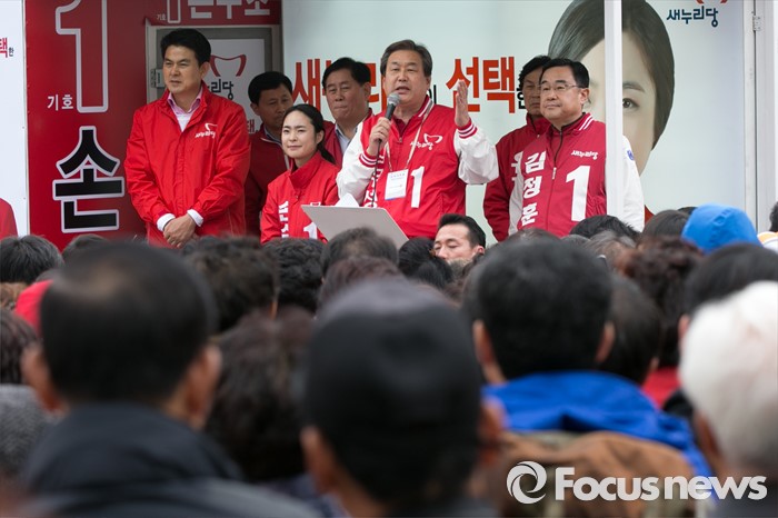 (부산=포커스뉴스) 김무성(오른쪽 두번째) 새누리당 대표가 3일 오후 부산광역시 사상구 광장로의 한 대형마트 앞에서 손수조 사상구 후보 지원유세를 하고 있다.