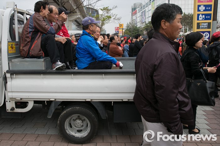 (부산=포커스뉴스) 3일 오후 부산광역시 사상구 광장로의 한 대형마트 앞에서 시민들이 손수조 새누리당 사상구 후보 유세를 보고 있다.