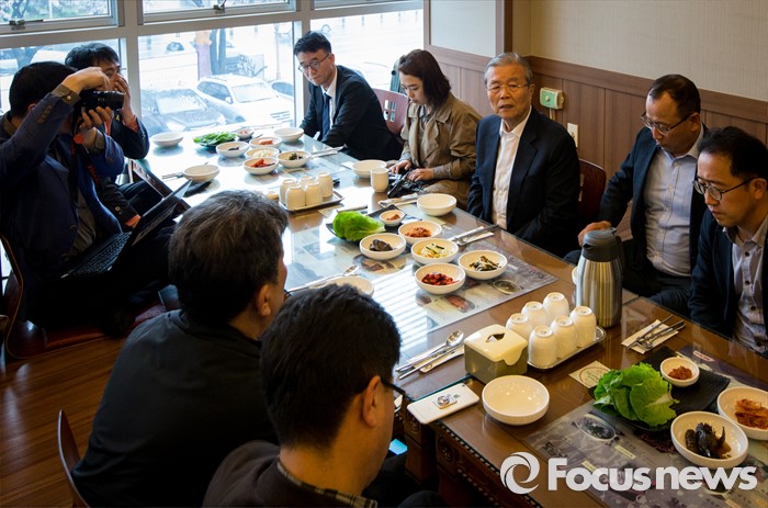 (제주=포커스뉴스) 김종인 더불어민주당 비상대책위원회 대표가 3일 오전 제주 시내의 한 식당에서 가진 오찬간담회에 참석해 취재진의 질문에 답하고 있다.