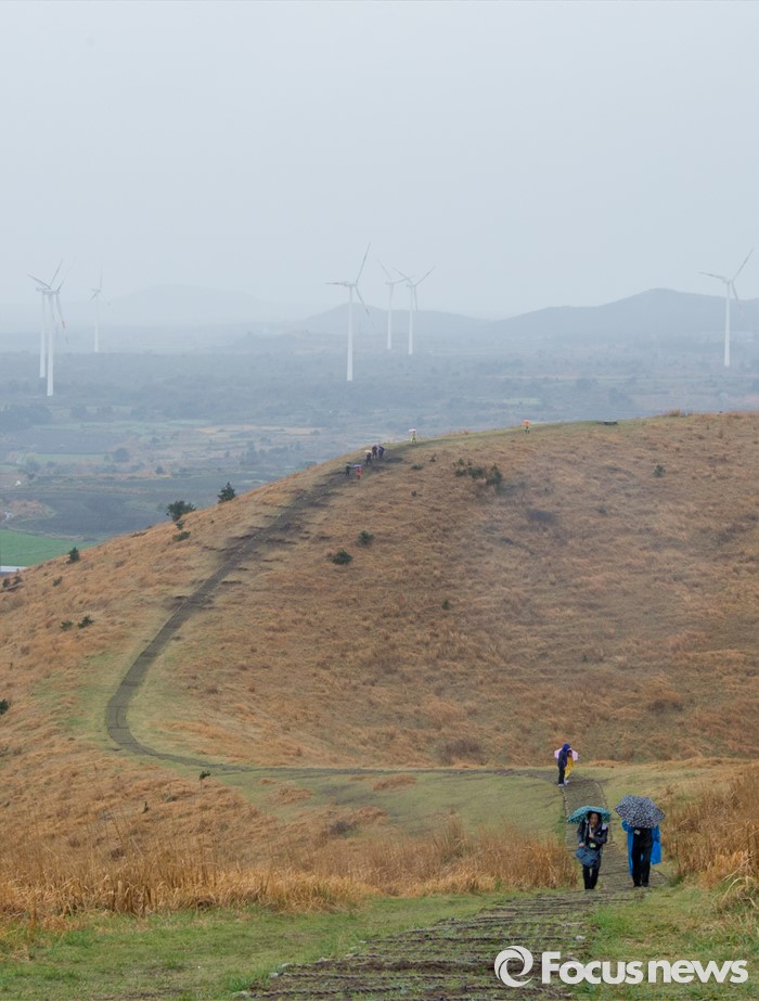 (제주=포커스뉴스) 3일 오후 제주 용눈이오름을 찾은 관광객들이 제주의 풍광을 즐기고 있다.
