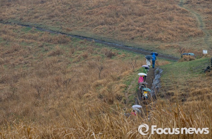 (제주=포커스뉴스) 3일 오후 제주 용눈이오름을 찾은 관광객들이 제주의 풍광을 즐기고 있다.