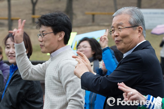 (서울=포커스뉴스) 3일 오후 서울 강서구 방화근린공원 일대에서 김종인 더불어민주당 비대위 대표 겸 선대위원장이 진성준 강서을 후보와 함께 유세를 하고 있다.