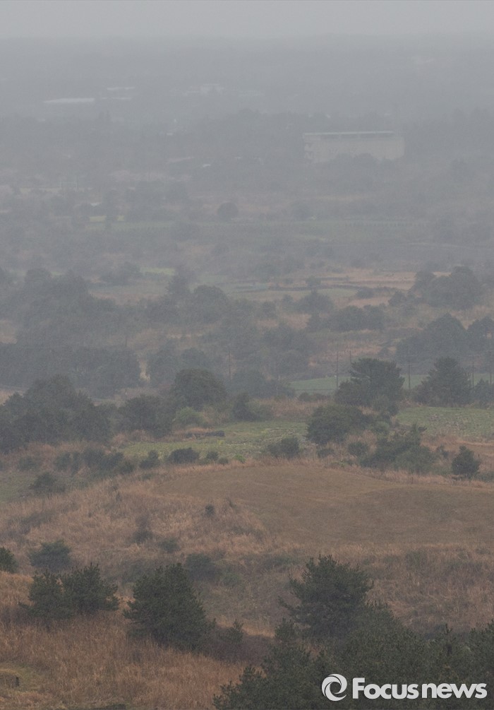 (제주=포커스뉴스) 3일 오후 제주 용눈이오름에서 바라본 제주의 모습이 안개 속에 싸여 있다.