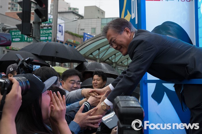 (서울=포커스뉴스) 선거운동이 시작되고 첫 주말을 맞은 3일 오후 문재인 전 더불어민주당 대표가 서울 강동구 암사시장에서 진선미 더불어민주당 강동구갑 후보와 합동유세를 하고 있다.