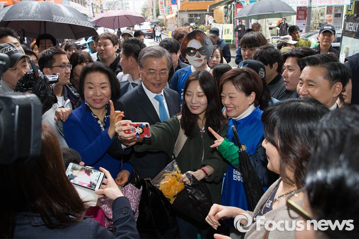 (서울=포커스뉴스) 선거운동이 시작되고 첫 주말을 맞은 3일 오후 문재인 전 더불어민주당 대표가 서울 강동구 암사시장에서 진선미 더불어민주당 강동구갑 후보와 합동유세를 하고 있다.