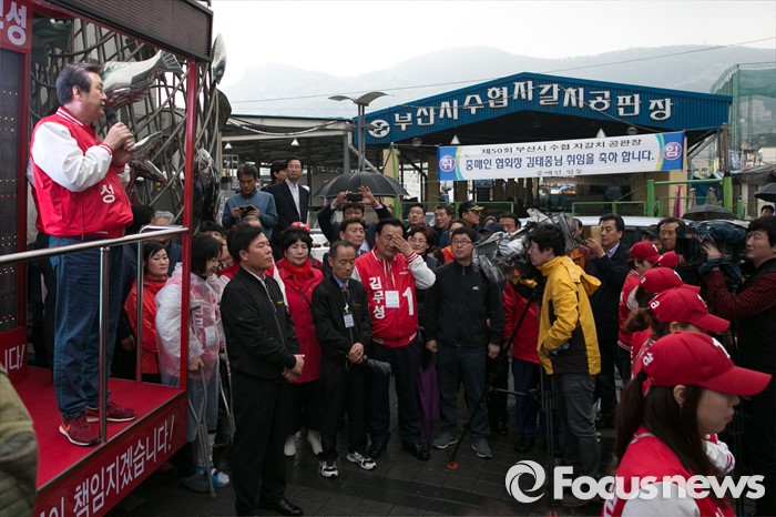 (부산=포커스뉴스) 부산광역시 중구영도구에 출마한 김무성 새누리당 대표가 3일 오후 부산시 중구 자갈치시장 공동어패류조합 앞에서 유세를 하고 있다.