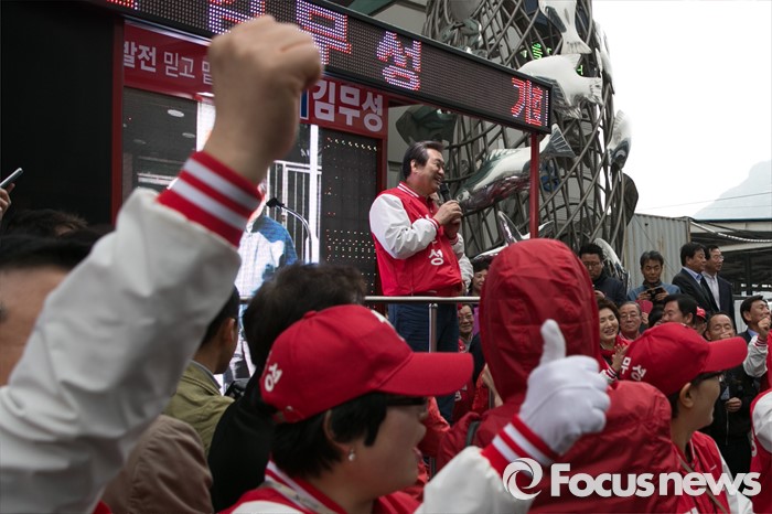(부산=포커스뉴스) 부산광역시 중구영도구에 출마한 김무성 새누리당 대표가 3일 오후 부산시 중구 자갈치시장 공동어패류조합 앞에서 유세를 하고 있다.