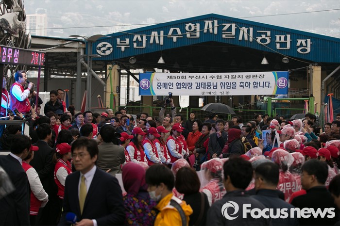 (부산=포커스뉴스) 부산광역시 중구영도구에 출마한 김무성 새누리당 대표가 3일 오후 부산시 중구 자갈치시장 공동어패류조합 앞에서 유세를 하고 있다.