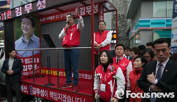 (부산=포커스뉴스) 부산광역시 중구영도구에 출마한 김무성 새누리당 대표가 3일 오후 부산시 영도구 남항시장 입구에서 유세를 하고 있다.