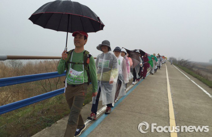 (목포=포커스뉴스) 불교환경연대소속 회원들이 3일 전남 목포시 영산강하구에서 사대강 생명살림 100일 순례를 시작하면서 포장된 자전거길을 걷고 있다.<사진=불교환경연대제공>