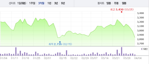 4일 오전 9시11분 현재 MPK는 전일 대비 4.7%(140원) 하락한 2840원에 거래되고 있다. 52주 최저가인 2735원과도 100원 밖에 차이가 나지 않는 상황이다.