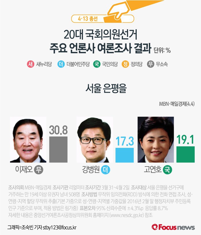 (서울=포커스뉴스) MBN과 매일경제가 공동으로 리얼미터에 의뢰해 3월 31일부터 4월 2일까지 서울 은평을 선거구에 거주하는 유권자 508명을 대상으로 여론조사를 실시한 결과, 무소속 이재오 후보의 지지율이 30.8%, 더민주 강병원 후보와 국민의당 고연호 후보의 지지율은 각각 17.3%, 19.1%인 것으로 나타났다.