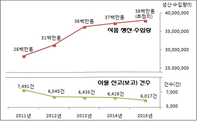 식품 생산·수입량의 증가(2011년 2800만톤→2015년 3800만톤)를 고려하면 이물 신고건수가 35%(2014년 기준) 이상 감소된 것으로 추정된다.