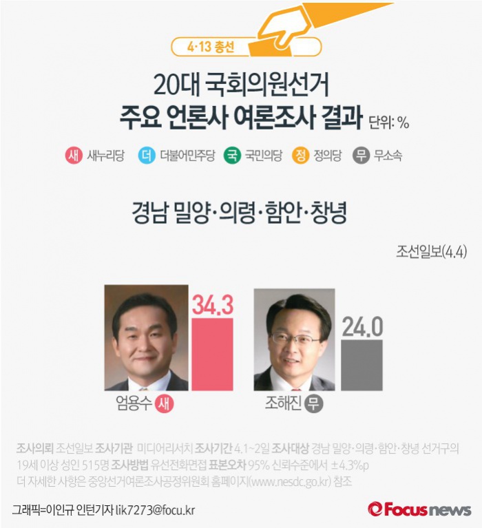 (서울=포커스뉴스) 조선일보가 여론조사기관 미디어리서치에 의뢰해 4일 발표한 결과에 따르면 후보지지도는 엄용수 후보(34.3%), 조해진 의원(24.0%), 김충근 무소속 후보(7.0%), 우일식 국민의당 후보(4.0%), 이구녕 무소속 후보(0.6%) 순으로 조사됐다.
