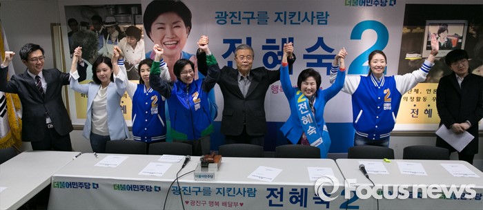 (서울=포커스뉴스) 4일 오전 전혜숙 더불어민주당 서울 광진갑 후보 선거사무소에서 중앙선거대책위원회의에 앞서 김종인 비대위 대표 겸 선대위원장, 전 후보, 장하나 의원과 비례대표 후보들이 20대 총선 사전투표 독려 캠페인을 마친 뒤 취재진을 향해 손을 들어 포즈를 취하고 있다.